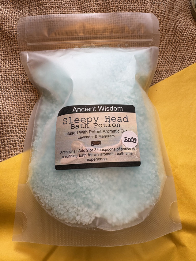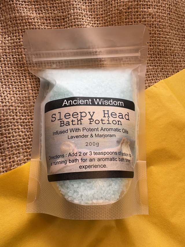 Experience ultimate relaxation with our Sleepy Head Bath Potion, inspired by ancient wisdom. Available in 200g or 500g sizes, this potent blend combines pure Lavender and Marjoram essential oils infused in natural sea salt to soothe your mind and body. Perfect for calming restless evenings, it helps promote restful sleep and relieves tension after a long day. Please note, due to a labeling error, the weight and expiry date have been corrected accordingly. This is a non-returnable item. Enhance your self-care routine with this luxurious, calming bath potion designed to transform your bath into a tranquil retreat.